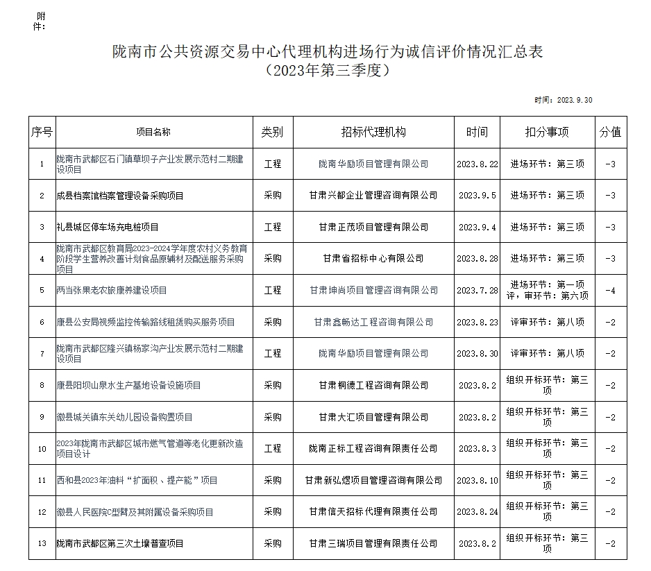 根據(jù)《甘肅省公共資源交易代理機構(gòu)管理辦法》(甘政辦發(fā)〔2019〕107號)和《隴南市公共資源交易中心代理機構(gòu)進場行為誠信評價實施制度(試行)》規(guī)定,現(xiàn)對2023年第三季度,共 12 家代理機構(gòu) 13 條進場行為誠信評價記錄予以通報(詳見附表)。請各代理機構(gòu)嚴(yán)格遵守各項規(guī)章制度、誠實守信,規(guī)范操作,為招標(biāo)人和采購人提供專業(yè)、高效、規(guī)范的招標(biāo)代理服務(wù)。