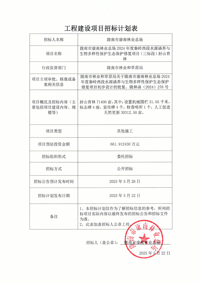 隴南市康南林業(yè)總場2024年度秦嶺西段水源涵養(yǎng)與生物多樣性保護(hù)生態(tài)保護(hù)修復(fù)項(xiàng)目(三標(biāo)段)封山育林