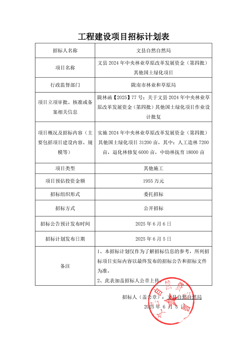 文縣2024年中央林業(yè)草原改革發(fā)展資金(第四批)其他國土綠化項目招標(biāo)計劃表.pdf
