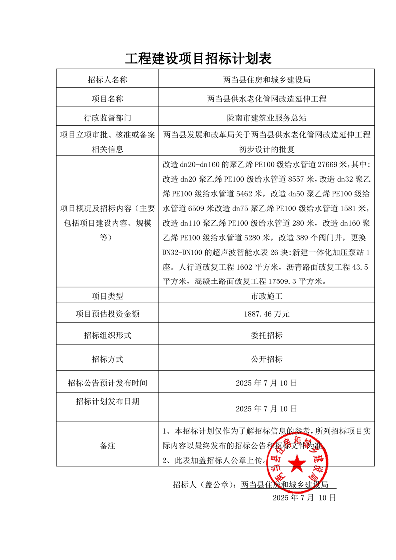 兩當(dāng)縣供水老化管網(wǎng)改造延伸工程