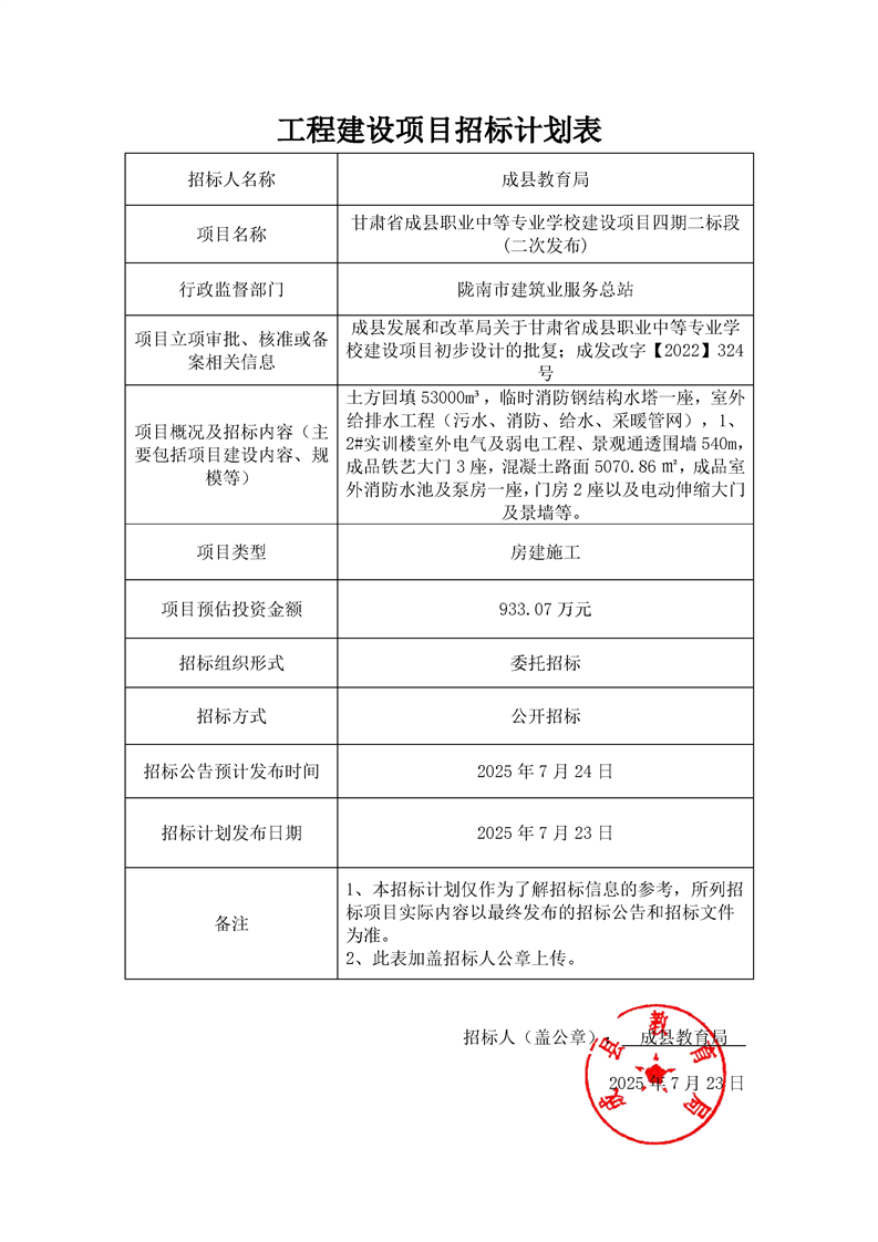 招標計劃表—甘肅省成縣職業(yè)中等專業(yè)學(xué)校建設(shè)項目四期二標段.pdf