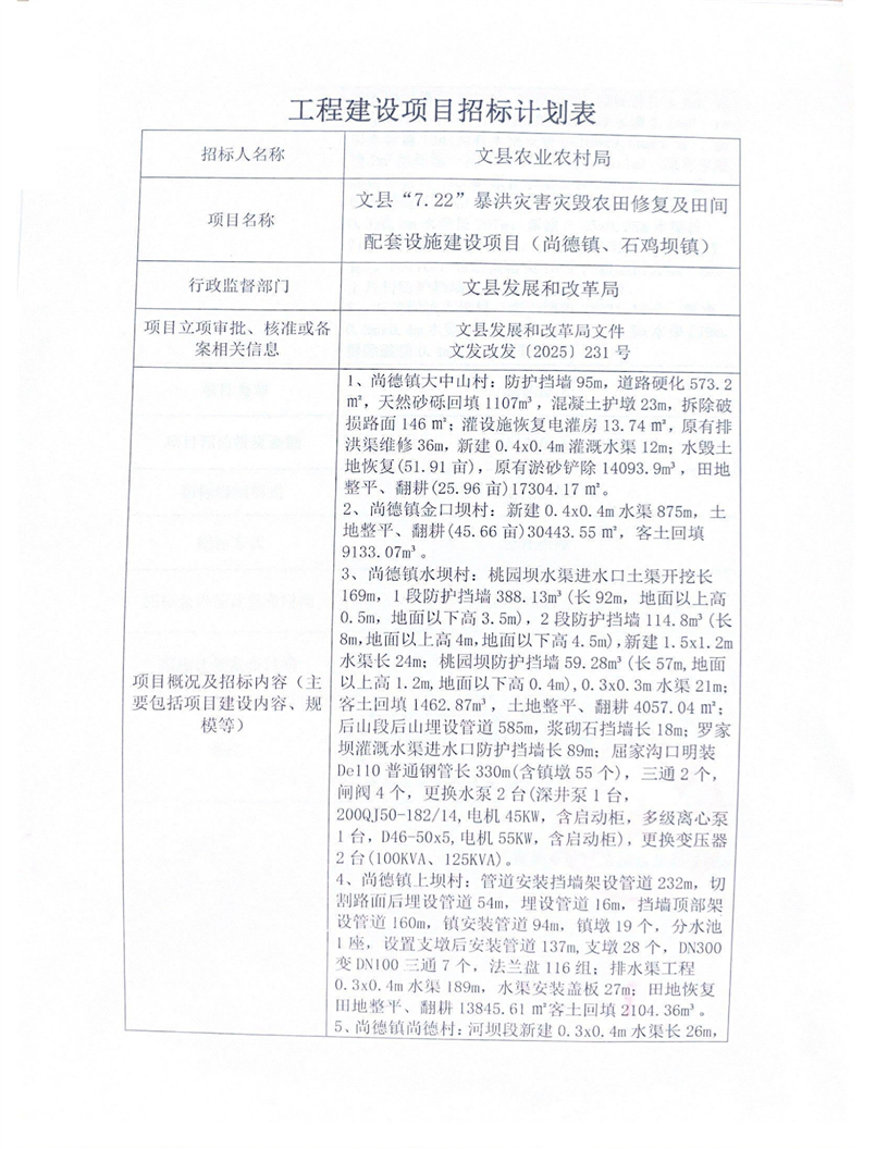 文縣“7.22”暴洪災害災毀農(nóng)田修復及田間配套設施建設項目(尚德鎮(zhèn)、石雞壩鎮(zhèn))