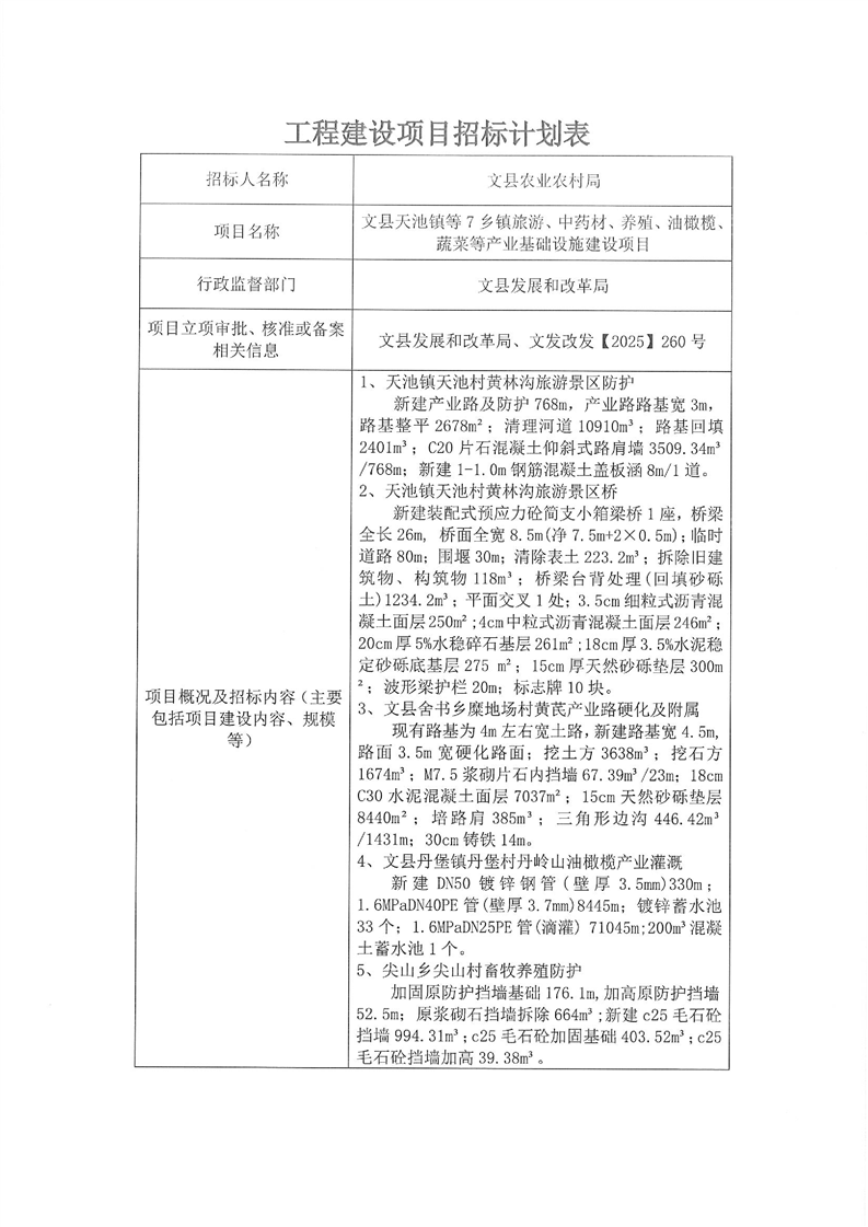 文縣天池鎮(zhèn)等7鄉(xiāng)鎮(zhèn)旅游、中藥材、養(yǎng)殖、油橄欖、蔬菜等產(chǎn)業(yè)基礎(chǔ)設(shè)施建設(shè)項(xiàng)目