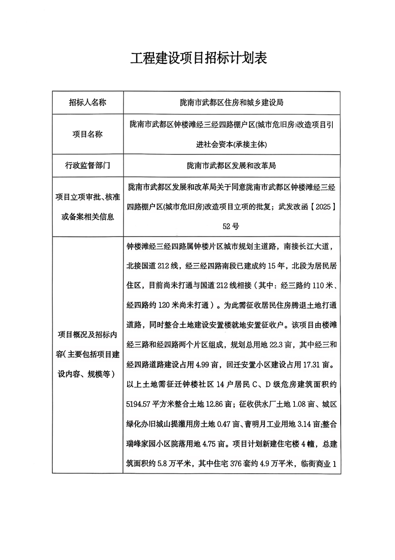 隴南市武都區(qū)鐘樓灘經三經四路棚戶區(qū)(城市危舊房)改造項目引進社會資本(承接主體)
