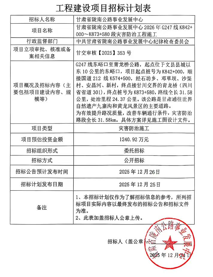 甘肅省隴南公路事業(yè)發(fā)展中心2026年G247線K842+000~K873+580段災害防治工程施工