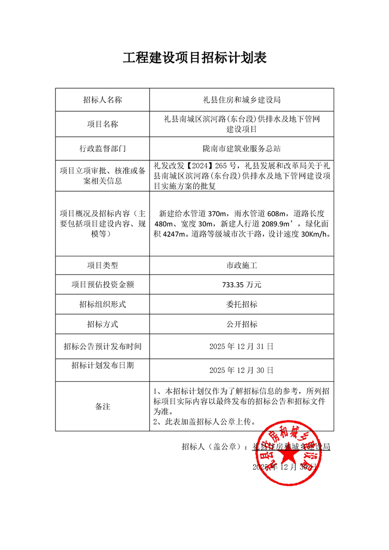禮縣南城區(qū)濱河路(東臺段)供排水及地下管網(wǎng)建設(shè)項目