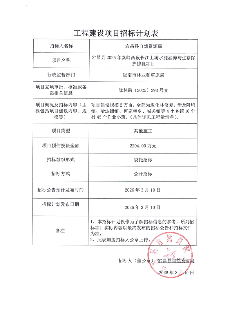 宕昌縣2025年秦嶺西段長江上游水源涵養(yǎng)與生態(tài)保護修復項目