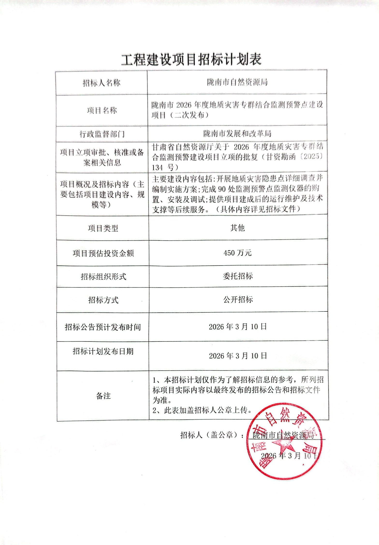 隴南市2026年度地質(zhì)災害專群結(jié)合監(jiān)測預警點建設項目(二次發(fā)布)