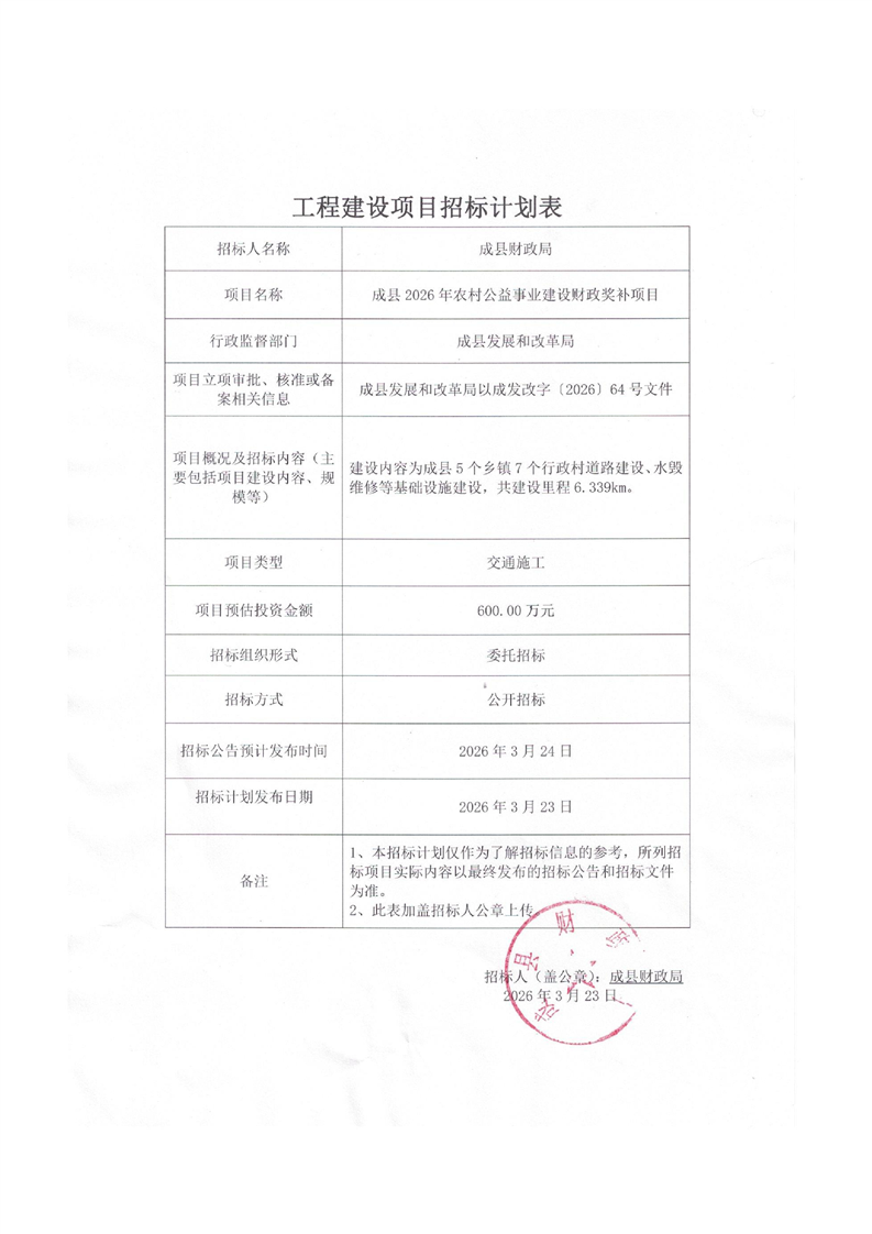 成縣2026年農(nóng)村公益事業(yè)建設(shè)財政獎補項目