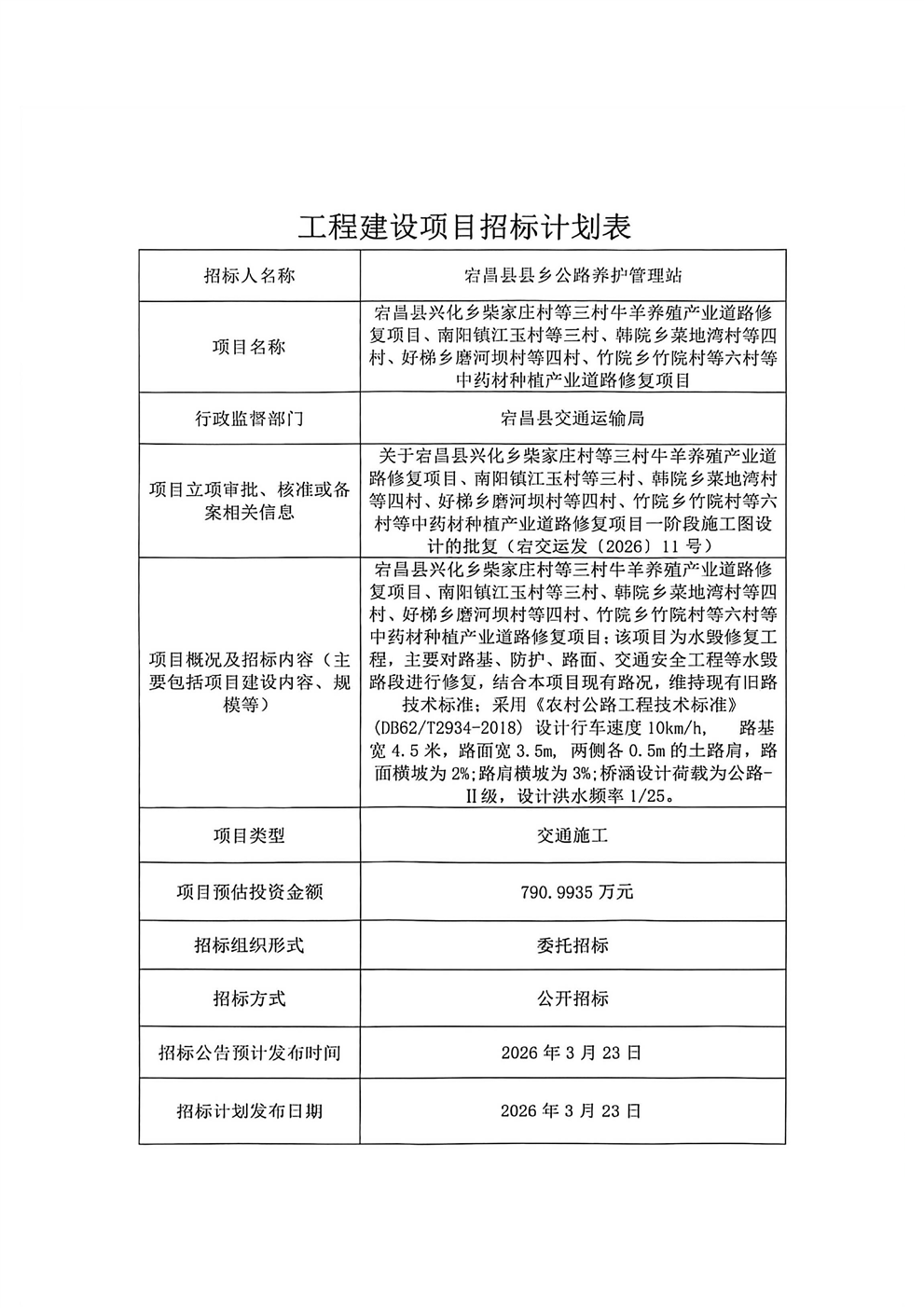 宕昌縣興化鄉(xiāng)柴家莊村等三村牛羊養(yǎng)殖產(chǎn)業(yè)道路修復(fù)項(xiàng)目、南陽(yáng)鎮(zhèn)江玉村等三村、韓院鄉(xiāng)菜地灣村等四村、好梯鄉(xiāng)磨河壩村等四村、竹院鄉(xiāng)竹院村等六村等中藥材種植產(chǎn)業(yè)道路修復(fù)項(xiàng)目