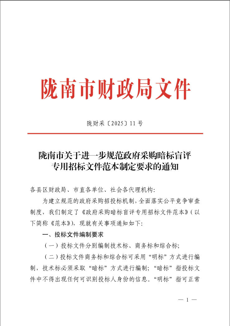 隴南市關(guān)于進(jìn)一步規(guī)范政府采購暗標(biāo)盲評(píng)專用招標(biāo)文件范本制定要求的通知